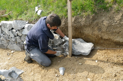 Auf einer Länge von gut 40 Metern entlang des Rebberges hat Philipp im Frühjahr 2017 als Schulabschlussarbeit eine Trockensteinmauer errichtet. Als angehender Maurer war das genau sein Arbeitsmaterial. Insgesamt hat er 20 Tonnen Steine in den unterschiedlichsten Grössen und Formen verbaut.